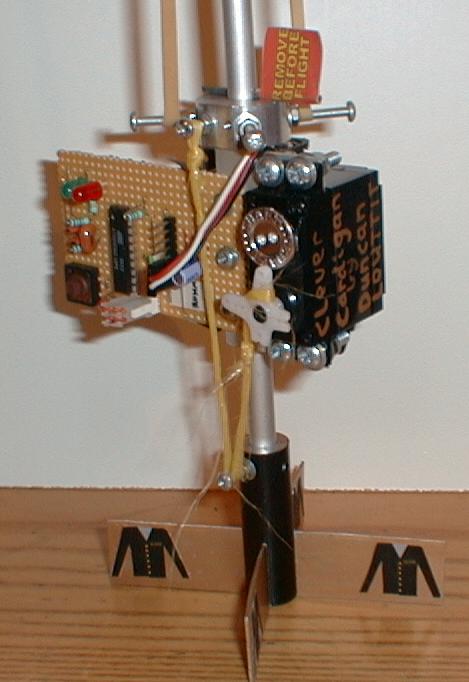 When I found out about Techno Games 2000 I decided that I ought to have a go myself. When I got the rules of the classes and spoke to one of the technical support guys it became obvious that my best chance was to make a high jumper. I decided that rubber bands were the easiest energy store especially as our postman delivers me a couple every day. I measured one to check the forces and extensions that it could manage then plugged the numbers and likely masses into a spreadsheet to see what was likely. It seemed to be possible to jump about 3 metres without too much trouble. My first plan, like most people's, was to use a fuse as the trigger mechanism. After many wasted hours and lots of experimentation, I decided that this was not such a good idea. The problem is that any wire strong enough to hold the force from the elastic bands was too tough for me to blow without enormous batteries. The solution was to use a radio control servo as the holding mechanism.