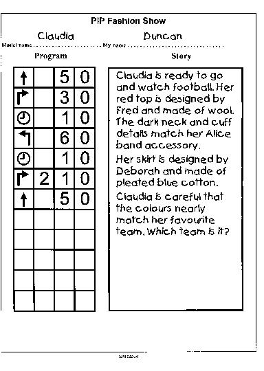 The idea is that the children design and make outfits for a mannequin. PIP moves the mannequin to make it "strut its stuff" on a catwalk. While PIP is moving, the children read out a prepared commentary to go with the outfit and the movements. ![]() The activity has clear design and technology content and straightforward control content. However, speaking and writing may be the area where many teachers feel that this activity has a large contribution to make. The children have to write a commentary to match the movements of PIP. As PIP moves at a moderate speed and will normally do a sequence of actions such as showing its left side then its right side, the commentary needs to move on at an appropriate pace and go through similar stages as the program. The children are forced to develop the "plot" of the commentary to match the actions. Afterwards you will have the written commentary together with the matching program and outfit. These should meet any recording requirements. Link to four pages of photocopiable masters. The cover fits over PIP to provide a stand for the mannequin. The mannequins can be used on their own or the outfits can be used to dress them up. The recording sheet allows the program and commentary to be kept together. As well as these sheets you will need to have at least pencils, crayons and scissors. It is a good idea to be aware of how difficult it can be for left-handed children to use normal scissors. You may want to add pieces of material, glue, glitter, sequins etc. if you are feeling brave! The most enthusiastic may want to have materials to make the catwalk etc. A simple sheet of cardboard cut to shape can form the catwalk. You can make a proscenium arch from a cardboard box. One idea is to use thin material glued across the arch and cut into narrow strips so that PIP can make an appearance through these "curtains" and retire behind them at the end of the performance. The first thing to do is photocopy the cover sheet. If you can copy it straight onto card, this is best, alternatively you can copy it onto sticky paper and then stick that to card, or copy onto ordinary paper and then glue that to card. Cornflakes packet card is about the right thickness. ![]() Now you can cut out the two pieces that make the cover. The rule is to cut along the solid lines, fold down along the dashed lines, and fold up along the lines with long and short dashes. The black parts are scrap, the shaded parts fold under the front and back and the starred parts are stapled together. The mannequin stand is a separate piece that should be completely cut out. It is best to crush the card along the fold lines with a hard pencil or ball-point pen to make the folding easier. Do not make the folds yet. One end of the prop is left attached to the rest of the cover and the other end is cut free. Next make the cuts at the corners of the base, make the folds near the sides of the base, and staple the corner pieces under the front and back. ![]() Now you should staple the mannequin stand to the front of the cover and then to the prop. Stapling to the prop is difficult but do not worry too much about appearances, just put two staples there. Once the mannequin stand is attached, you should make the folds that you scored earlier. These give it a lot of stiffness. The folds are towards the back of PIP so that they don't get in the way of the mannequin. There are two copies on the sheet to make copying quicker. If you want to give the children more drawing and cutting-out practice, and save some copying, you could make a master mannequin on cardboard and get them to draw round it and cut that shape out. ![]() You can add a face to the mannequin before copying or you can ask the children to draw the face later. Cutting out the mannequins should be straightforward. This is the reason it has no fingers, toes or hair! The only problem may be the slot to fit the mannequin to the stand. It may be best for a teacher or classroom helper to do these with a scalpel. It is a good idea to open up the slot and check that it fits on the stand before starting to dress the mannequin up. There is no reason why you or the children shouldn't design your own mannequins. They could even be cut-out from a magazine if you get the size roughly right. You can stick on faces cut from magazines for topical characters if you like. The simplest outfit is just to colour-in the mannequin. It is easy for a child to draw a stripey top in one colour and colour-in the legs to make trousers. If you do this, it is best for the children to colour-in the mannequin before cutting it out. This is easier for the child and gives a better result. Make sure that the children draw things like buttons and belts to get the best effect. You can make this simple outfit much jazzier by sticking things on. Glue and glitter is one approach to making the outfits more attractive. Another idea would be to stick bits of feather or cloth on. A feather in the hat is easy to do if the hat is just drawn on the mannequin. If you decide to use the clothes on the sheet provided, the children will find them much more difficult to cut out because of the tabs. Remember that tabs can always be taped back on in the event of mishaps! Like the mannequins, it is easiest to colour-in the clothes before cutting them out. You are not limited to the shapes as drawn. It is easy to modify the trousers into shorts or make the dress and skirt shorter. The necklines are another area where children can use their design talents. You can ask the children to design other types of clothes. For example a sarong should be possible and a sash should be fairly straightforward. The funny shape in the bottom right-hand corner of the clothes sheet is a hat with a brim. An alternative approach to fitting a hat would be to have two slits in the bottom and fit it over the mannequin's head. Having thought about the outfits to be shown, the next question is how best to display them. Part of this 