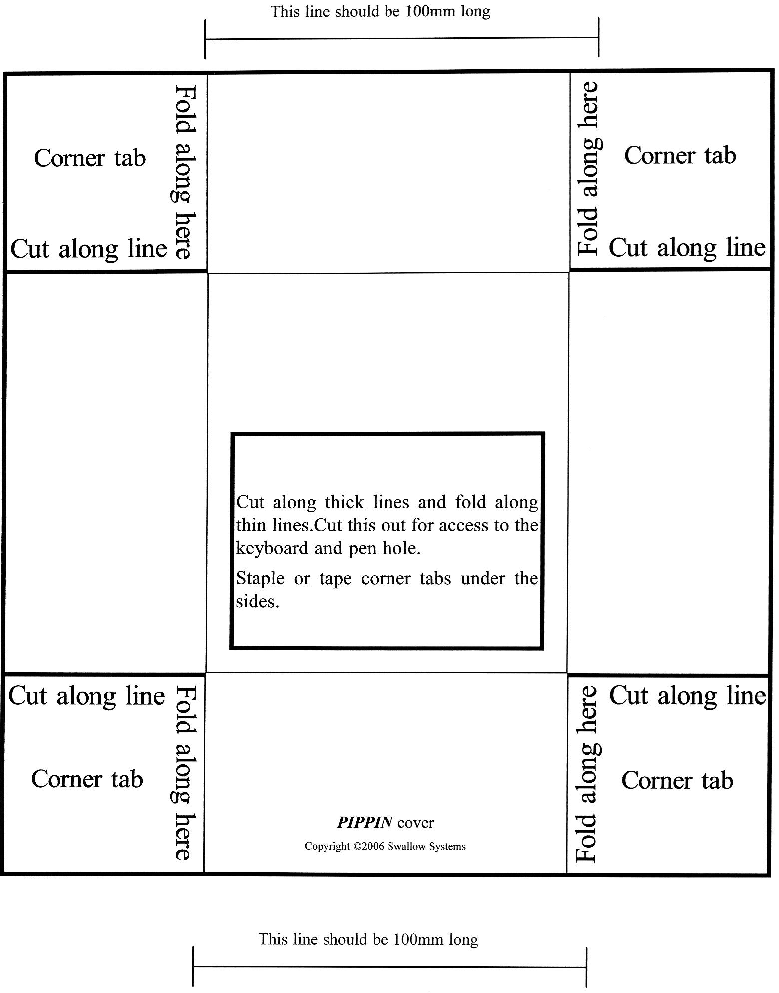The cover can be used to make any personality for PIPPIN by drawing on it or adding pictures (but note the use of magnets to hold pictures onto PIPPIN's steel casing). There is a blank cover in full-size, jpeg form that you can download for customising. Simply open it with a suitable drawing package and away you go! The easiest way to print it out is to bring it into Word or a DTP package, adjust the 100mm lines to be 100mm long (Word has rulers to help with this). Make sure that you get the sizing by changing just the size, not the shape, and then print it out.