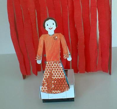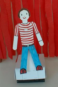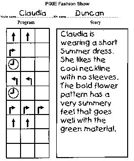 Mannequin There are two copies on the sheet to make copying quicker. If you want to give the children more cutting-out practice, and save some copying, you could make a master mannequin on cardboard and get them to draw round it and cut that shape out. You can add a face to the mannequin before copying or you might ask the children to draw the face later. Cutting out the mannequins should be straightforward. This is the reason it has no fingers, toes or hair! The only problem may be the slot to fit the mannequin to the stand. It may be best for a teacher or clasroom helper to do these with a scalpel. It is a good idea to open up the slot and check that it fits on the stand before starting to dress the mannequin up. There is no reason why you or the children shouldn't design your own mannequins. They could even be cut-out from a magazine if you get the size roughly right. The simplest outfit is just to colour-in the mannequin. It is easy for a child to draw a stripey top in one colour and colour-in the legs to make trousers. If you do this, it is best for the children to colour-in the mannequin before cutting it out. This is easier for the child and also gives a better result. ![]() Make sure that the children add things like buttons and belts to get the best effect.You can make this simple outfit much jazzier by sticking things on. Glue and glitter is one approach to making the outfits more attractive. Another idea would be to stick bits of feather or cloth on. A feather in the hat is easy to do if the hat is just drawn on the mannequin. If you decide to use the clothes on the sheet provided, the children will find them much more difficult to cut out because of the tabs.Remember that tabs can always be taped back on in the event of mishaps! Like the mannequins, it is easiest to colour-in the clothes before cutting them out. You are not limited to the shapes as drawn. It is perfectly O.K. to modify the trousers into shorts or make the dress and skirt shorter. The necklines are another area where children can use their design talents. Details such as buttons and belts can be added by drawing. Glitter and applique can also be used to enhance the effect. You can ask the children to design other types of clothes. For example a sarong should be possible and a sash should be fairly straightforward. The funny shape in the bottom right-hand corner of the clothes sheet is a hat with a brim. An alternative approach to fitting a hat would be to have two slits in the bottom and fit it over the mannequin's head. Having thought about the outfits to be shown, the next question is how best to display them. Part of this is the movements that PIXIE should make, part is the commentary that goes along with the movements. You may find it easiest to start with PIXIE's program. Encourage the children to keep it as simple as possible. A typical program would have PIXIE moving forward, pause, turn to one side then the other and then either back away or turn round and exit. Make sure that the children understand that they will have to write a story to go along with the movements and that the longer the PIXIE program the longer the story they will have to write.Having got an outfit and a "dance", each child will have to write a story to go along with it. The story should include the name of the model, a description of the outfit, both in terms of the types of clothes and the colours. Brighter children can synchronise things so that when PIXIE turns to the right, they talk about, for example, the watch that the model wears on its left hand. Children will have to test for themselves that the spoken story takes as long as the program. An ideal story will finish just as PIXIE finishes its dance. Either the dance or the story can be changed to make this happen. It is important that children record both their program and their story. The sheet provided is an example of how to do it with both the program and the story on one sheet. The full record for one child will also include the outfits and mannequins that they have made. ![]() In the example I show a typical program and story. This story is the correct length to go with the program when I read it. Others may read it more or less slowly! I show rather "posh" symbols for movements and pauses. It should be easy for a child to draw arrows for PIXIE's movements but it may be appropriate either to use a circle for the clock face symbol or a letter "p" for pause. Apart from the benefits to the teacher of having the child's efforts recorded, the child should use the record to program PIXIE and read out the story as the program is run. It should help the child remember exactly how the performance goes. It will be also be necessary for the children to write their names on the back of the outfits and mannequins so that you can tell who did what. For a full fashion show, there will be several models and different outfits. A record of the running order will be needed to allow time for outfits to be changed if one mannequin is used for several outfits. It is also appropriate for all the Summer clothes to be shown together and the Winter outfits at a different time in the show. It is quite an exercise in social skills for the children to negotiate the running order between themselves to get the best overall effect. There are a few ideas to make the fashion show even more professional. One simple thing is to make an archway for PIXIE to appear and disappear through. This works best with some form of curtains to hide PIXIE until it appears. We made ours out of cardboard covered with bright red sticky-backed plastic. It has narrow coloured crepe paper strips hanging down to make the curtains. You should consider changing the unit of turn for PIXIE. If you set it to 30o or 45o the movements, you will get a much better effect and the mannequins will be able to stand quarter-faced rather than always full-face or sideways-on. If you want a bit more "control" content, you could get the chi