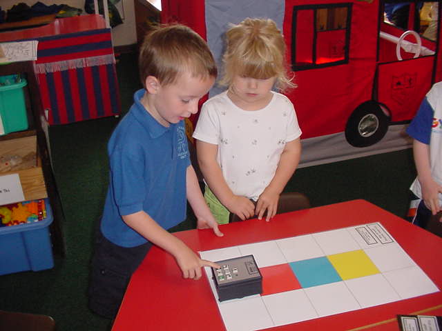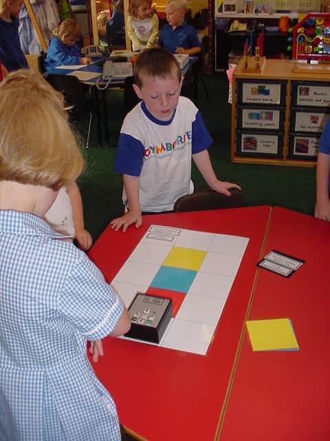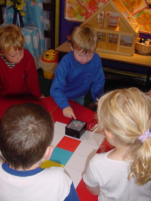 Making PIXIE work By pressing buttons you can make PIXIE pause or move forward, backward, left and right. Press Go to tell it to start a program. Press CM to make it forget its program. You can stop PIXIE urgently by pressing any button. Playing the game This is an introductory game for children who have not previously used PIXIE. Therefore, practitioners will need to model programming procedures and give clear instructions, sometimes supported with physical help. Shuffle the three primary colour cards and place them face down beside the play mat. Turn over the first card and program PIXIE to travel to that position. Practitioners should return PIXIE to the start position so that the next pupil may play. Support and Differentiation Pupils should be encouraged to repeat PIXIE vocabulary used by practitioners. Stress the importance of pressing CM each time a new program is entered. Play a similar gross motor game on colour and shape carpet tiles, telling the children how many jumps to make and making sure that they listen and remember, only moving off when told to Go. |