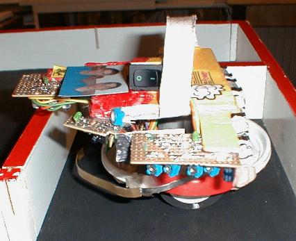 United Simpletons! Creag and Steve have a successful Formula 1 mouse in HorsePower but their efforts this year have concentrated on the "flat" courses with a mouse called Intelligent Thing. The hardware for IT was just about finished but the software was barely started when they found out about the Games. IT has plenty of sensor resources and processing power so it should have been easy to make it do the Ratrace. In a couple of weeks they were ready to put it on a course for the first time and this coincided with TV21 sending out a crew to film us at home. In consequence, TV21 have film of IT turning a wheel for the very first time. This was only a metre and quite slow but it did run.