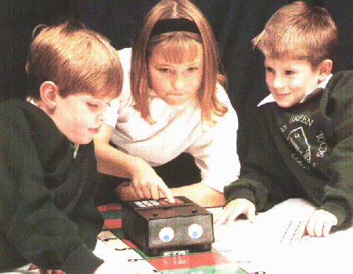 entry If PIP can understand a keypress, it gives a beep and flashes the LEDs. If it cannot understand because of a syntax error, PIP grumbles and does not flash the LEDs. When PIP's memory is full it will grumble if more program keys are pressed. Programming PIP is a matter of entering a command key (left column above) followed by one or more number keys. So you enter what PIP should do, followed by how much of it PIP should do. This is repeated until the whole program is entered. If you enter number keys when you should be entering a command key or vice versa, PIP will grumble and ignore the keypresses. As PIP uses numbers in this way, children will rapidly learn the significance of digit position and relative size. So, for example, they will find that "33" (3 repeated) is more than 10 times bigger than "3". Using single digits, it becomes clear that "8" is bigger than "5" by experiment. One of the simple things that can be done with PIP with younger children is to find out experimentally how much turn makes PIP go "all the way round". If PIP is set up for 1 degree turn units, the children will rapidly learn that 360 is the right number. The interesting thing is the trial and error process that leads to this. Young children may start with a turn of 10 degrees and see how small that is. Rather than immediately step to a number of perhaps 400, scaled up from the amount of turn they started with, they will often go up in steps of 10 degrees. They have not yet achieved an understanding of proportion. PIP is a useful tool for them to learn about proportion from an experimental point of view. |