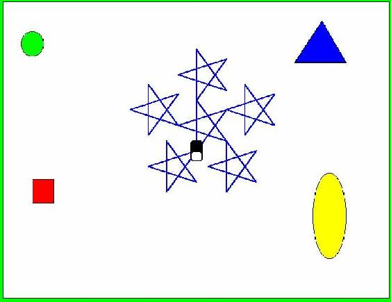 The centre-left of the screen is where the simulations take place. The background to this is a picture or graphic that is supplied by the user. In the example above the white background with the red square, blue triangle, green circle and yellow oval were drawn using Paint and stored as "picture.jpg" in the correct place in the filing system.