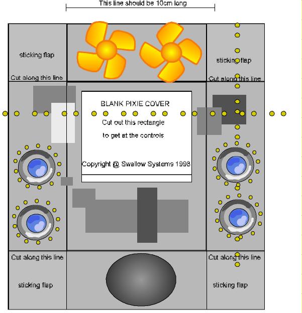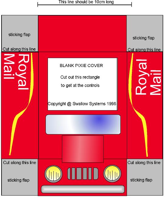 I was recently talking to Judy Burvill of Kent Schools Advisory Service and she showed me a PIXIE cover to make PIXIE into a rocket. It transpired that they have several covers for PIXIE, mostly designed by James Barrett. She was kind enough to email me the covers and gave me permission to put them on our website so that you can download them. Many thanks to her and The Kent ICT in schools team for this. For reasons that are probably obvious to everyone but me, she calls the covers "PIXIE hats". Extending this idea, you might like to ask the children to make PIXIE hats for an Easter parade. Anyway, here are the hats (or covers). Right click on an image and select "save picture as", then save it somewhere on your computer. Read the file into some kind of editing package, a DTP package is ideal but Word or similar will do. You can then resize it (use a corner rather than a side on Word), keeping the shape the same, until the marked line is 100mm long. I use the rulers supplied by Word at the top of my screen; the line typically goes from 4cm to 14cm. Once it is the right size either print out on thin card, I use 120gsm, or onto a label that you stick onto card. Cut it out, including the hole for the keyboard, cut along the four lines shown and staple or glue the cover together. These covers were done by editing the blank PIXIE cover that you can find here.