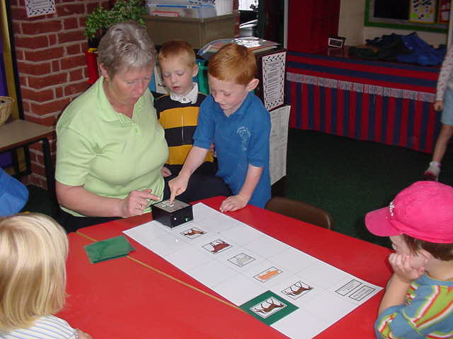 Making PIXIE work By pressing buttons you can make PIXIE pause or move forward, backward, left and right. Press Go to tell it to start a program. Press CM to make it forget its program. You can stop PIXIE urgently by pressing any button. Playing the game This is a game for children who have previously played First Colour Game. Practitioners encourage pupils to talk about what they want PIXIE to do and support them as they plan their programming. They should be encouraged to use appropriate PIXIE vocabulary throughout the activity. Pupils take the top animal card from the pile, laying it alongside the matching grid reference and then program PIXIE to travel to that position. Practitioners should return PIXIE to the chosen start position before the next player takes a card and begins to play. Support and Differentiation Remind pupils of the importance of pressing CM each time a new program is entered. Play a similar gross motor game using the small world farm. Help the farmer to drive around the farm environment as he checks his animals or collects them and drives them to the barn. As pupils gain greater confidence, practitioners may begin to scribe, recording the planned program onto a laminated record card. The pupils may then be supported as they read back the program and tap it in. |