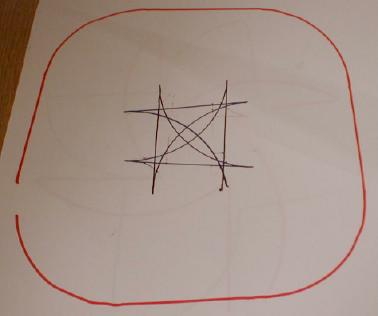 This set-up has two colours of pens; one on each side of PIXIE. The program is forwards, right forwards, right forwards, right to make PIXIE go round a "square" to the right. It is clear that the outer line in the scribble comes from the left-hand pen. At each corner, PIXIE turns away from the left-hand pen and scribbles an arc. The cumulative error in PIXIE stops the line from joining up. This kind of drawing, made with a single pen, is about the easiest one to explain. The centre part of the scribble, the bit made by the right-hand pen, seems harder to explain. It is important to realise that the pen can only do two things. It will only draw a straight line when PIXIE is moving straight. It will only draw an arc when PIXIE is turning. The centre scribble has 4 clear straight lines that were drawn when PIXIE ran the "forwards" instructions. You can also see the four arcs that correspond to the "right" instructions. The centre scribble makes better sense when you realise that the right-hand line was drawn at the same time as the left-hand line of the outer scribble. So, the first part of the scribble is two parallel lines. This is followed by two 90 degree arcs centred on the middle of PIXIE when it did the turn. This arc joins the right-hand and bottom lines of the centre scribble. The rest of the scribble is the same pattern repeated four times. It may be best to show the finished pattern and discuss why it looks as it does and then draw just a "forwards" instruction and see what you get. Follow this with "forwards" and "right" and see what you get. Finish up with "forwards", "right", "forwards" and then you should have a set of scribbles that allow you to explain the finished pattern. |
