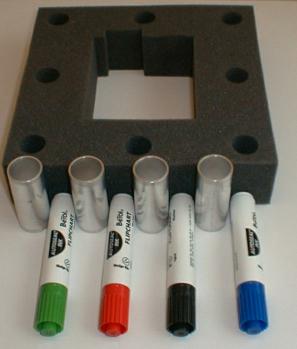 What you get What you get is a piece of foam that has been cut to fit closely over PIXIE. There is an extra cut-out to avoid the on/off switch. The foam has 8 holes punched in it for 8 alternative positions of the pens. You also get 4 aluminium tubes and 4 Berol pens. The tubes fit into whichever holes in the foam you want to use and the pens slide up and down in the tubes. You might start off with just one pen at the front or back of PIXIE and work up to all four. I do not recommend using more than 4 pens at a time.