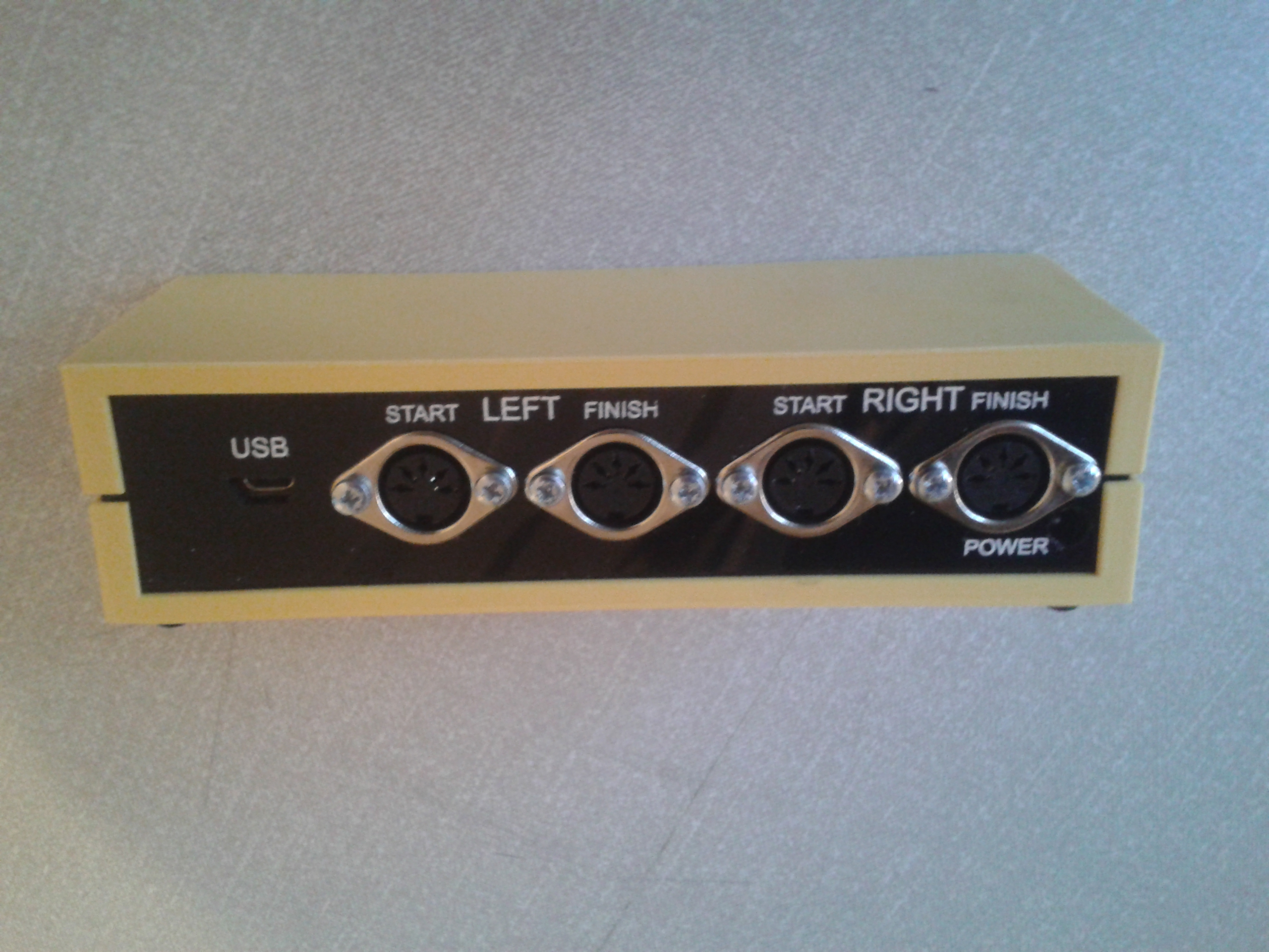 The leads from the four gantries are taken to the timing device via 4 way cable. The wires are for ground, 3V3, 5V and signal. Inside the timing device they are taken to the relevant power levels and individual I/O pins of a NUCLEO development board. The Nucleo boad has a USB connector to couple it to a PC. This is used to program the processor and also as a serial link. There is a wallwart 5V power supply for the LEDs as these need 50mA each to get the desired brightness. I didn't want to rely on the USB power for this. The Nucleo board is powered from the USB connection. The casing for the timing device is made from two 3D printed pieces and two laser-cut pieces.